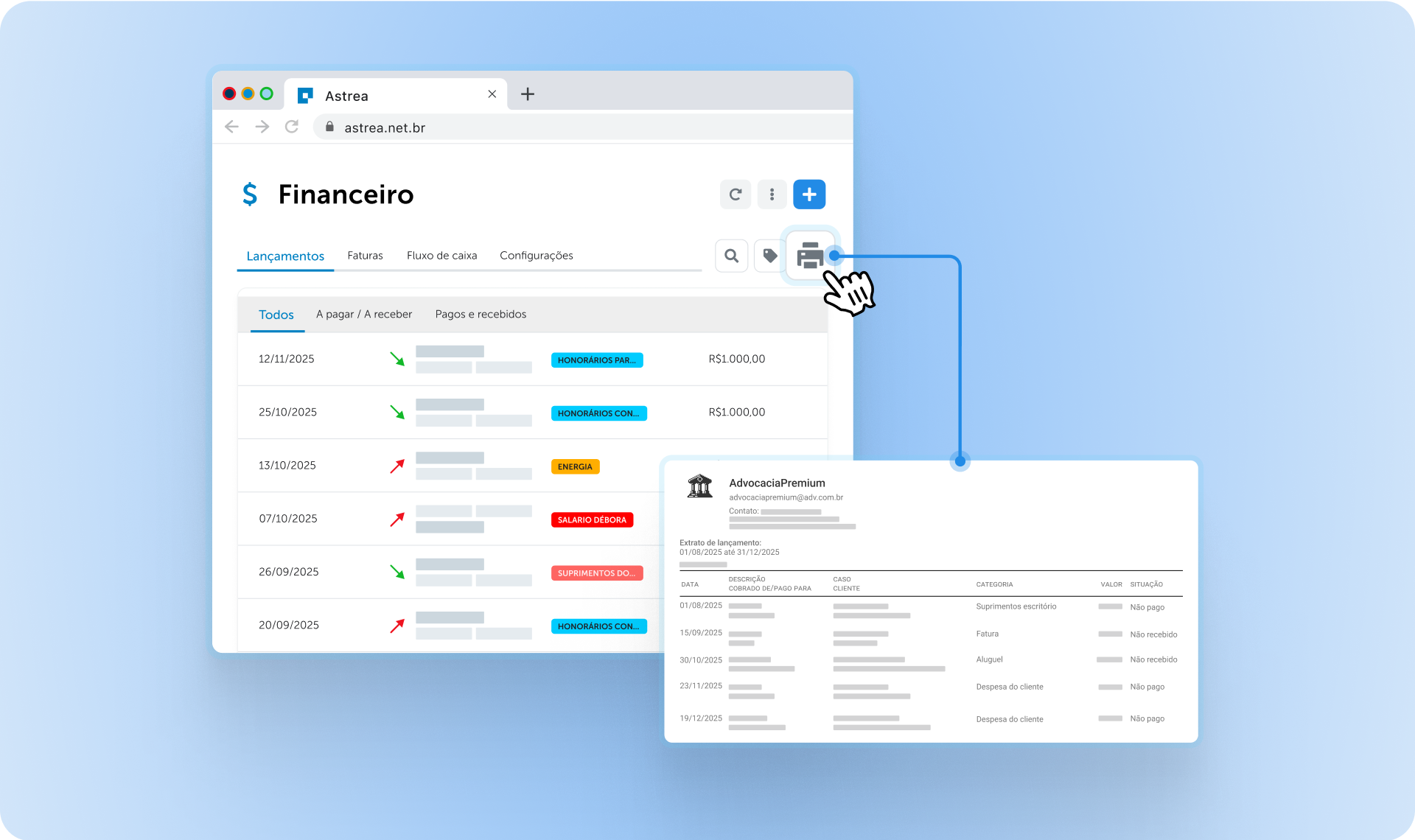 Diga adeus às planilhas manuais e às surpresas no fim do mês. Com o Astrea, você integra finanças e processos em um único sistema, emite boletos e ganha previsibilidade de caixa, sem complicação.