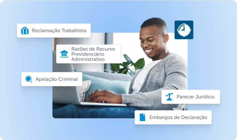 Transforme insumos estratégicos em textos fundamentados rapidamente. Com as nossas IAs, é possível buscar jurisprudências reais e utilizar mais de 45 modelos para entregar um texto completo e pronto para a sua revisão.