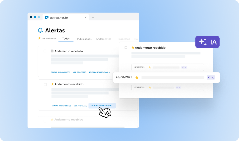 Com centenas de notificações diárias, saber por onde começar é essencial. O Astrea classifica automaticamente seus andamentos, baseando-se na interpretação do conteúdo, para que você priorize o que é urgente.