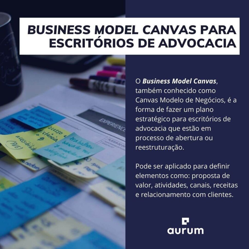 O Business Model Canvas, também conhecido como Canvas Modelo de Negócios, é uma forma de fazer um plano estratégico para empreendimentos jurídicos que estão sendo abertos ou reestruturados. Pode ser aplicado para definir elementos como: proposta de valor, atividades, canais, receitas e relacionamento com clientes de escritórios de advocacia.