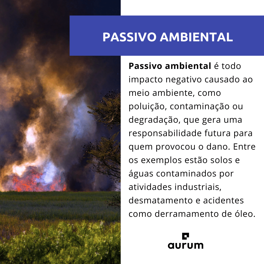 Passivo ambiental é todo impacto negativo causado ao meio ambiente, como poluição, contaminação ou degradação, que gera uma responsabilidade futura para quem provocou o dano. Essa responsabilidade pode incluir obrigações legais, custos financeiros e ações técnicas, como recuperar áreas afetadas, reduzir os impactos ambientais e pagar multas. Entre os exemplos estão solos e águas contaminados por atividades industriais, desmatamento e acidentes como derramamento de óleo.